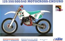 This 1991 KTM 125 350 500 540 Motocross Enduro Owners Handbook is an authorized reproduction of the original manual. It will familiarize you with how to operate your 1991 KTM 125/350/500/540 Motocross Enduro motorcycle. It will teach you how to tune your motorcycle to your specific needs and how to protect yourself against injury. This book contains important information on motorcycle maintenance. This manual is an important part of your motorcycle and should be passed on to any subsequent owner in case you decide to sell it. Many motorcyclists have a good working knowledge of motorcycle mechanics; if this is true in your case, you will be able to use this manual to carry out most of the maintenance steps yourself. Take special care to follow the recommended run in, inspection, and maintenance intervals. Heeding these guidelines will significantly increase the life of your motorcycle.