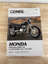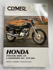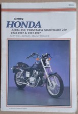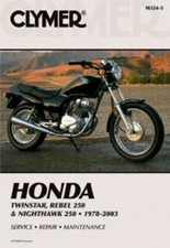 This Clymer Honda Rebel 250 Twinstar Nighthawk 250 1978-2003 Repair Manual provides detailed service information, step-by-step repair instruction and maintenance specifications for 1978-1979 Honda CM185T Twinstar, 1980-1982 Honda CM200T Twinstar, 1982-1983 Honda CM250C Custom, 1985-1987 & 1996-2003 Honda CMX250C Rebel, 1986 Honda CMX250CD Rebel Limited, and 1991-2002 Honda CB250 Nighthawk motorcycles.