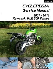 The Cyclepedia Press LLC 2007 2008 2009 2010 2011 2012 2013 2014 Kawasaki KLE650 Versys motorcycle service manual features detailed BLACK AND WHITE photographs and wiring diagrams, complete specifications with step-by-step procedures performed and written by a seasoned Kawasaki dealer trained technician.