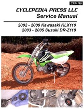 Do you need to repair your Kawasaki KLX 110 or Suzuki DRZ 110 motorcycle? The Cyclepedia Press LLC 2002-2009 Kawasaki KLX 110 & 2003-2005 Suzuki DR-Z 110 printed service manual features detailed black and white photographs and wiring diagrams, complete specifications with step-by-step procedures performed and compiled by a veteran Kawasaki dealer trained motorcycle technician. The color images shown here are from the online manual which you get access to for free with your print manual purchase.