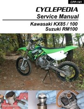 The Cyclepedia Press LLC Kawasaki KX 85 / KX 100 – Suzuki RM 100 printed motorcycle service manual features 365 pages of detailed black and white photographs and wiring diagrams, complete specifications with step-by-step procedures performed and written by a veteran Kawasaki dealer trained motorcycle technician.