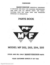 This 351 page, Massey Ferguson MF202 203 204 205 Parts Manual is a reproduction of the original, out of print manual. This book contains numbered pictures giving you great detail on assembly and disassembly and also gives you a guide, with numbers, for ordering parts, and makes you seem much more informed when talking to the dealer.