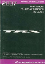 This 2007 TRX420TE FE Fourtrax Rancher 420ES 4×4 CF Owner Manual Owners Manual is the FRENCH version of the small booklet that should have originally come with your motorcycle. Contains basic operation instructions, safety warning, facts and driving tips.