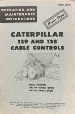 Operators & Maintenance Manual for cable controls covering Caterpillar models 129 and 128 with serial numbers 18F1 and up (Double Drum) and 19F1 and up (Single Drum). This detailed manual provides vital information on operating procedures, routine maintenance tasks, lubrication schedules, and safety practices specific to these cable control units. Regular reference to the Caterpillar 129 128 manual ensures proper care of your equipment and helps extend service life by reducing wear and preventing common issues during operation.