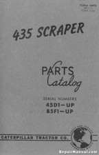 This Used Caterpillar 435 Scraper Parts Manual (April 1958) with serial numbers 45D1 and up is an essential resource for equipment technicians, restoration professionals, and parts buyers working with the Cat 435 scraper model. This Caterpillar 435 scraper parts manual provides detailed exploded-view diagrams with part numbers and assembly guidance, specifically for serial numbers 45D1 and up—ensuring you identify and order components with precision.